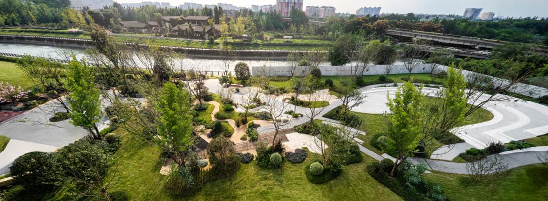 项目创新性地将这座代建公园与内部“海棠九章”园林体系,规划为一个有机串联、无缝过渡的“公园共同体”。公园成为社区的绿色前厅与自然延伸,有效串联起外部的壮阔河岸与内部的静谧庭院,构建出多层次、可参与、沉浸式的全景生活场。